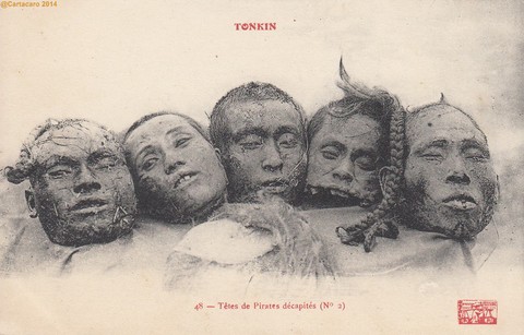 Image ref. Postcard of severed heads of Vietnamese “pirates” in 1880s French Indochina, “Pirates, highwaymen or resistance against colonization were hunted down by the French army, killed in fighting, imprisoned, tried, condemned or executed. The executions were carried out according to the rite of the Annamese law, law of the country, by beheading.”; INDOCHINA old postcards