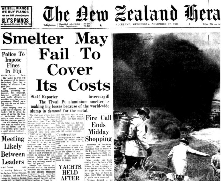 “Despite the heavily depressed market, the smelter company has continued with its New Zealand expansion programme and yesterday the Prime Minister, Mr Muldoon, opened the $237 million third plotline at Tiwai Pt.”