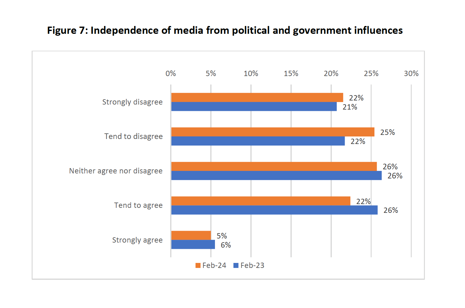 The study’s findings show trust in news in general fell significantly from 42% in 2023 to 33% (-9%) in 2024 and the proportion of those who actively avoid the news to some extent grew from 69% in 2023 to 75% (+6%) in 2024.