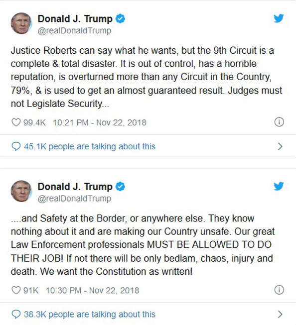 The Trump-Roberts dispute occurred after a lower court judge in California temporarily blocked the administration’s bid to revise asylum policies for would-be immigrants. Trump referred to U.S. District Judge Jon S. Tigar—appointed by President Barack Obama in 2012—as an “Obama judge.”