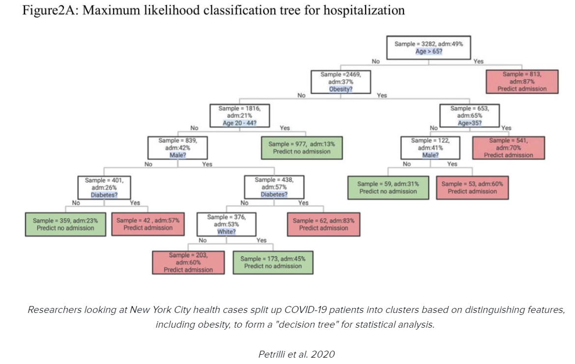Based on the largest case series from the United States to date Petrilli et al found that an accurate predictive model for hospital admission could be constructed. After age, the factors are obesity, male sex, diabetes and white race.