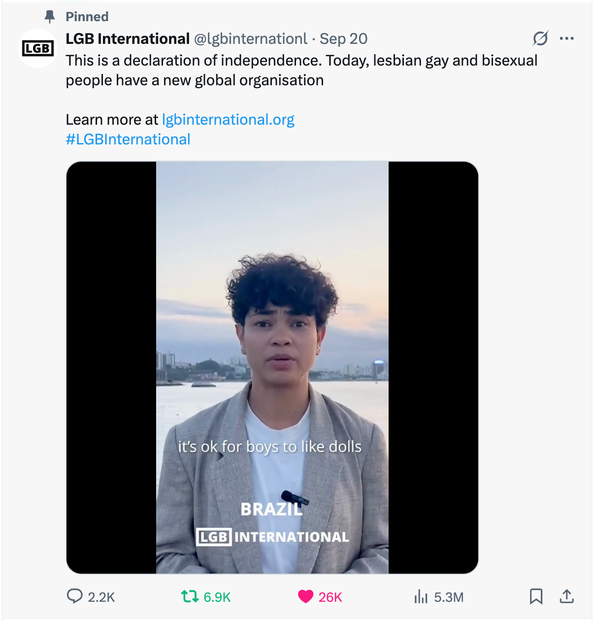 LGB International and its national affiliates exist to promote and defend the rights and interests of lesbians, gay men and bisexuals. We organise, meet and advocate based on the reality of biological sex and sexual orientation and without any political affiliation. We defend freedom of speech and advocate for our rights and interests and protest against discriminatory policies and practices, including in employment, education, housing, health care, partnership, family and other areas. We highlight the dual discrimination faced by lesbians (as women and homosexuals) and support the legal right of separate assembly based on biological sex and sexual orientation.We advocate for the right of adults and young people to mature, develop and explore their sexuality and personalities without gender identity ideology. Children should be protected from medical transition treatments. We combat harmful misinformation and disinformation about gender identity ideology which particularly targets lesbians, gay men and bisexuals.