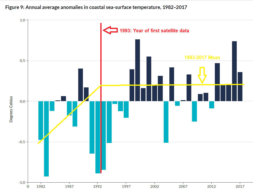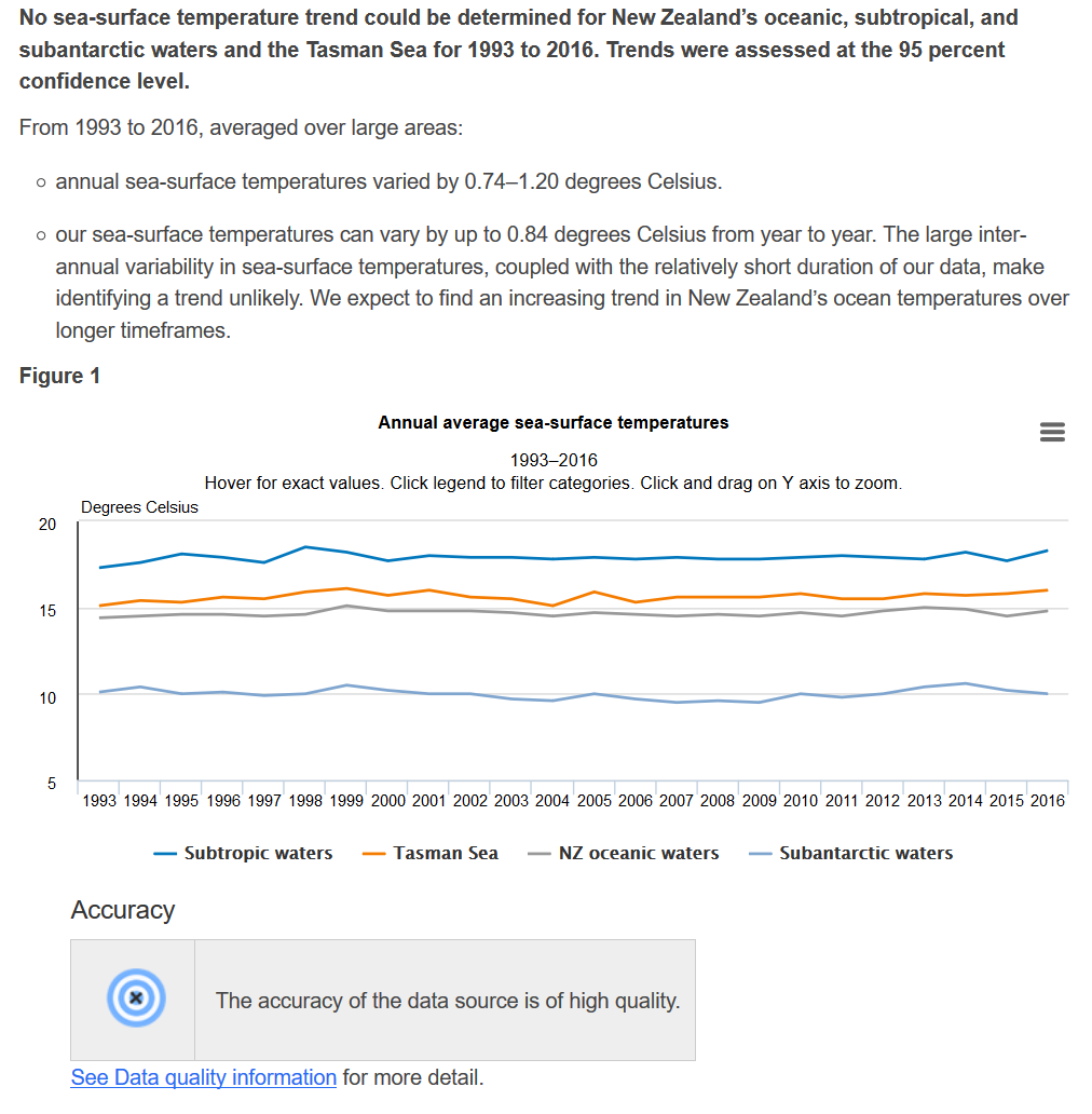 Just over two years ago we were assured that the entire era of satellite monitoring (since 1993) showed zero temperature increase: “No sea-surface temperature trend could be determined for New Zealand’s oceanic, subtropical, and subantarctic waters and the Tasman Sea for 1993 to 2016. Trends were assessed at the 95 percent confidence level.” And here it is, in colour; Zero, Nothing, Niet: