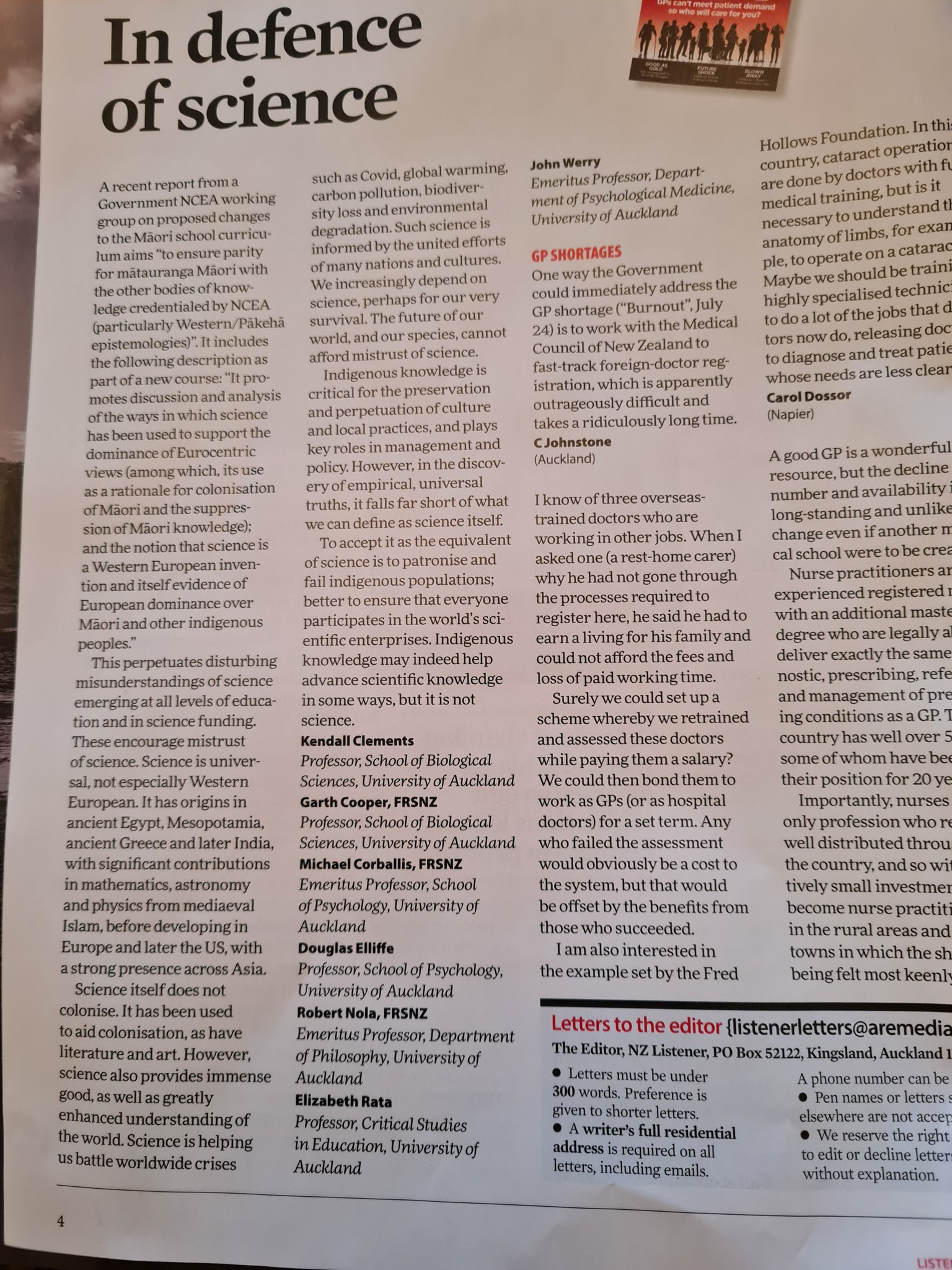 They were among seven eminent professors who signed a letter published in the Listener in July that objected to matauranga Maori (Maori knowledge) being given equal status in the school science curriculum with what an NCEA working group referred to as “Western” science. The Royal Society quickly denounced the professors: