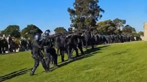 Riot police fired rubber bullets and tear gas at anti-vaccination and construction protesters after they overran Melbourne’s Shrine of Remembrance in the worst civil rebellion at the national memorial since the Vietnam War.