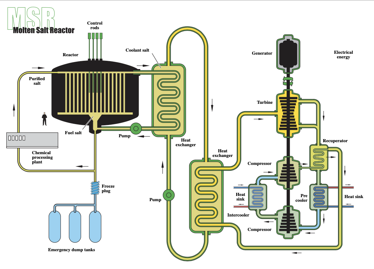 - Coolant (or fuel) salt exchanges heat with CO2 to drive turbine and make electricity