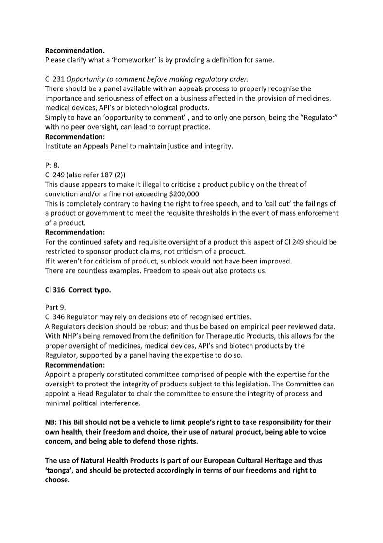 “Pt 8. Cl 249 (also refer 187 (2)) This clause appears to make it illegal to criticise a product publicly on the threat of conviction and/or a fine not exceeding $200,000. This is completely contrary to having the right to free speech, and to ‘call out’ the failings of a product or government to meet the requisite thresholds in the event of mass enforcement of a product.”