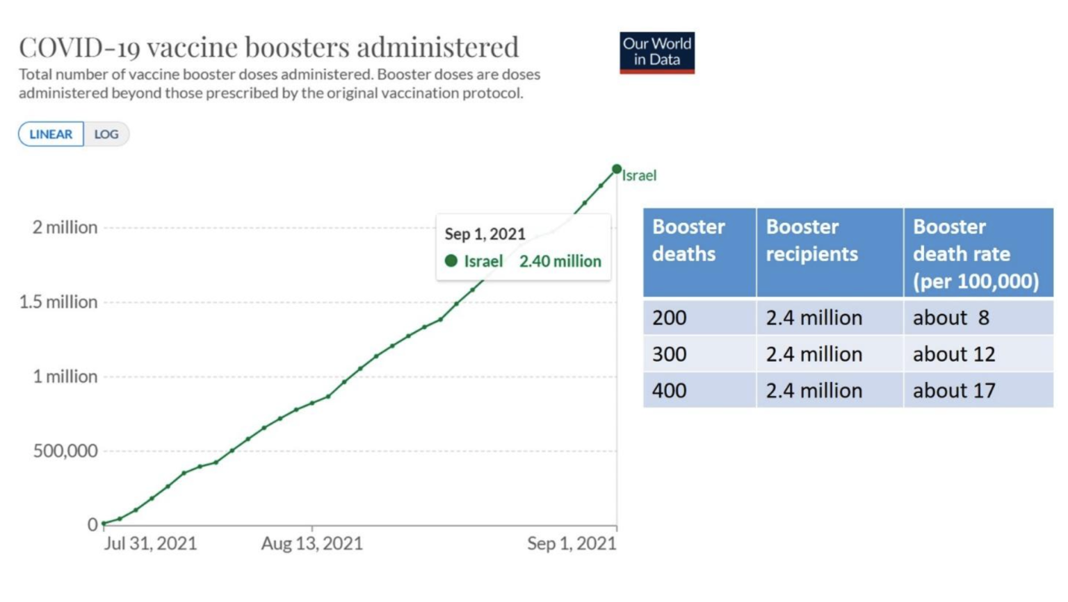In a recent article, Gibson studied the association between the booster rollout in New Zealand and rising excess mortality. He estimated 16 excess deaths per 100,000 booster doses (95% CI: 5 to 27). The results from Israel fall in that range.