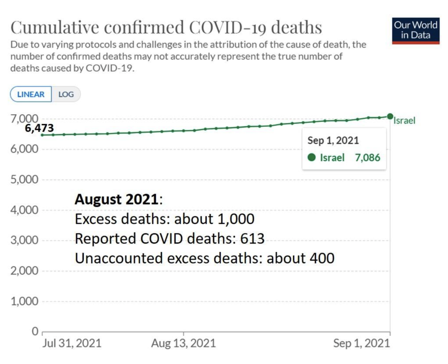 - On the other hand, there was a tendency in Israel (and elsewhere) to over-count Covid deaths – sometimes substantially. During the previous winter (December 2020 through March 2021), the estimated number of excess deaths was half the number of reported Covid deaths, which means that half of reported Covid deaths were “death with Covid,” not “from Covid.” If that level of misclassification persisted in August, the number of true Covid deaths should be smaller, and the number of unaccounted excess deaths – much larger.