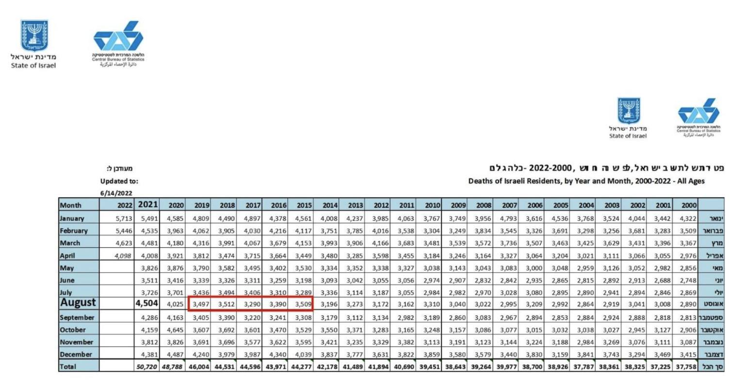 The Israel Central Bureau of Statistics counted 4,504 deaths, from all-causes, during the month of August 2021. How many were expected? How many fall in the category of excess deaths?
