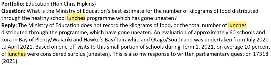 “In March, the Education Minister boasted that over three million lunches had been served up. In answer to a Written Question to the ACT Party, Chris Hipkins said an evaluation of 60 schools showed that around 10 percent were “surplus.”