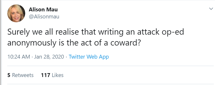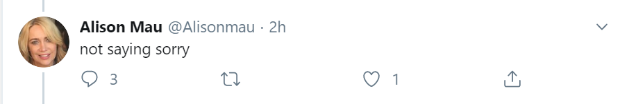 Why should she say sorry? She doesn’t need to apologise. She wrote an article expressing her opinion, and so did I. This is a world where, at least for the moment, we still have free speech. We are both entitled to our opinions. Nothing to apologise for, Alison.