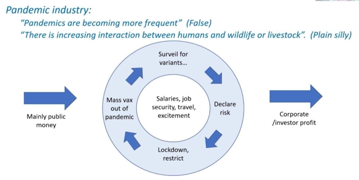 In their letters to the Attorney-General and Human Rights Commissioner, the concerned NZ delegation highlighted the fact that an annual budget of US$30 billion is being sought, which dwarfs the current total WHO budget for all programs, of around US$5.5 billion per year. This is absurd given that pandemics are extraordinarily rare, and cause insignificant mortality compared to the challenges of all other WHO programs. The absurdity begins to make sense if you consider Dr David Bell’s Pandemic Industry infographic.