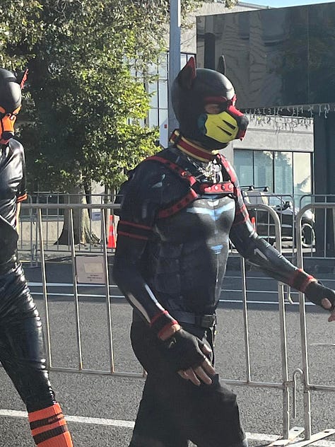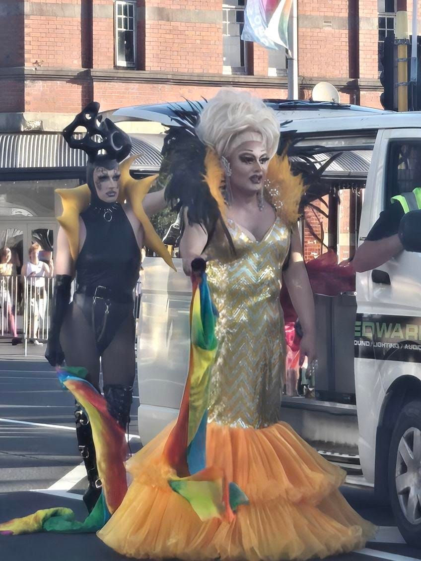 The treacherous police were followed by the Indian community, the Chinese community, craven corporates such as Fonterra, Fletchers and Dentons, swaggering drag queens, glittery drag king Hugo Grrl, the person who threw the tomato juice over Kellie-Jay Keen-Minshull, men in dog face masks (creepy but also funny), people decorated with colourful sausage balloons and other sundry dressed-up folk.