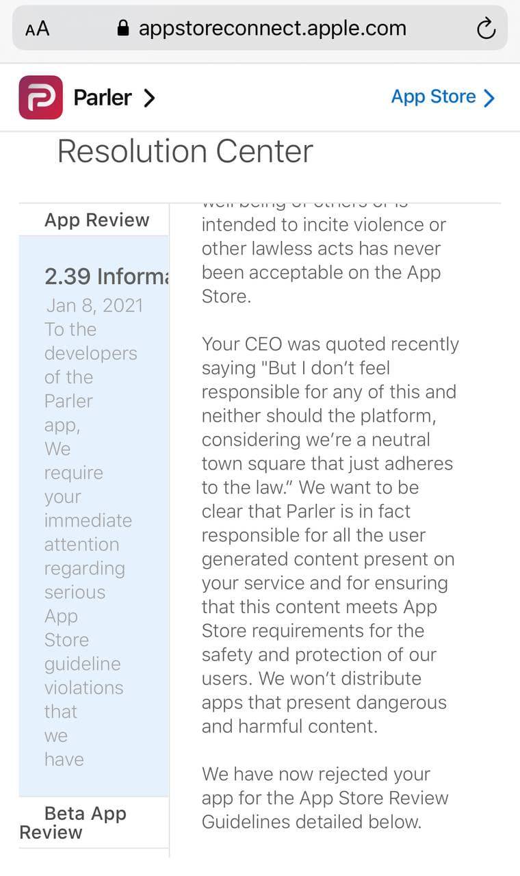 Apple will be banning Parler until we give up free speech, institute broad and invasive policies like Twitter and Facebook and we become a surveillance platform by pursuing guilt of those who use Parler before innocence.