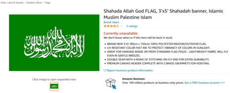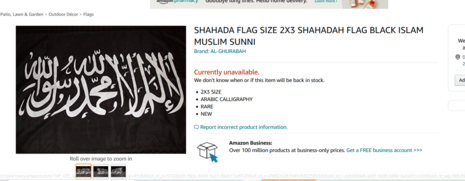 Finally, a black flag with the shahada emblazoned on it is also sold on Amazon. This flag appears to be the same style of flag that former Al-Qaeda leader Osama bin-Laden posed in front of during videos.