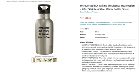 Items with violent rhetoric also remain listed on Amazon. Apparel that says “I even resist if my blood flows” and a water bottle with the phrase “introverted but willing to discuss insurrection” remain listed on Amazon.