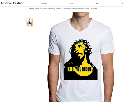 Some of the items sold on Amazon are upsetting to Catholics and Christians who may find the images offensive. One T-shirt had Jesus Christ on the front, along with the slogan, “Kill Your Idols.”