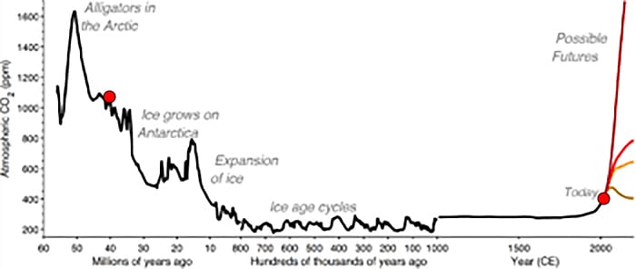 In fact, as this graph shows, we’re nowhere near the high levels of atmospheric CO2 experienced the Eocene. And almost certain not to get there in the next century or two. Of the “possible futures” shown in that graph, the only one projecting such high levels is the most extreme – and even by the IPCC’s reckoning, highly unlikely – scenario.
