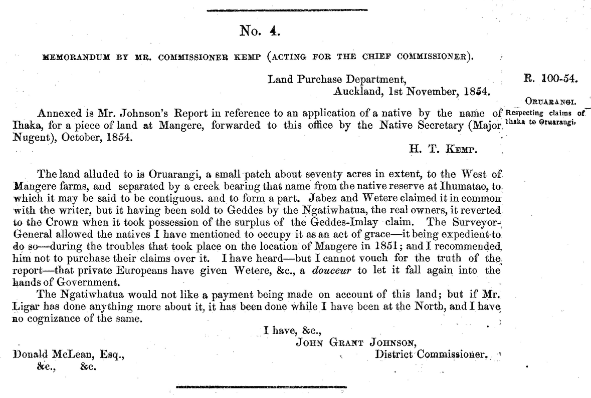 1854: John Johnson, District Land Commissioner, advises Donald MacLean, Chief Commissioner, of a possible dispute. He advises that local men; Ihaka of Ngati Te Ahiwaru and two others, descended from Tainui, have made a claim to the Oruarangi section of Ihumatao. Johnson advises against settling with them as Ngati-Whatua were the rightful proprietors and Ihaka’s people occupy Ihumatao only by the ‘grace’ of the Commissioner and in view of the 1851 ‘troubles’. Johnson reports some settlers possibly offered douceurs (bribes) to the native men to induce them to drop their claim.