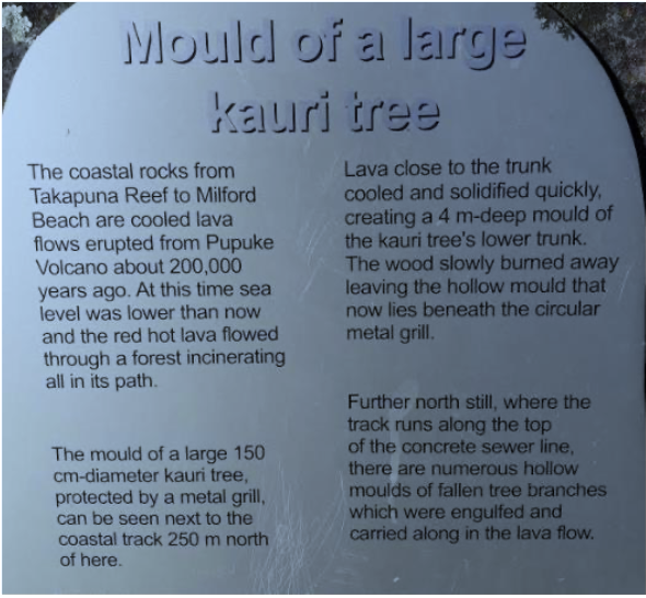 “The coastal rocks from Takapuna Reef to Milford Beach are cooled lava flows erupted from Pupuke Volcano about 200,000 years ago. At this time sea level was lower than now and the red hot lava flowed through a forest incinerating all in its path.”