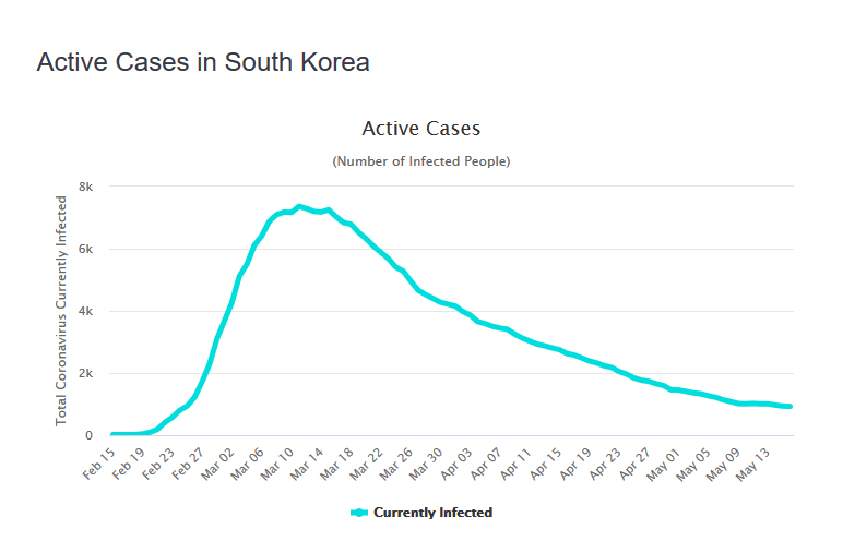 South Korea – Peaked mid March and clearly a steady decline ever since – no sign of a second spike