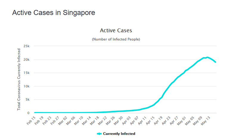 Singapore – Very little early infection then a spike over four weeks 10 April to 10 May followed by a decline which would appear to be continuing