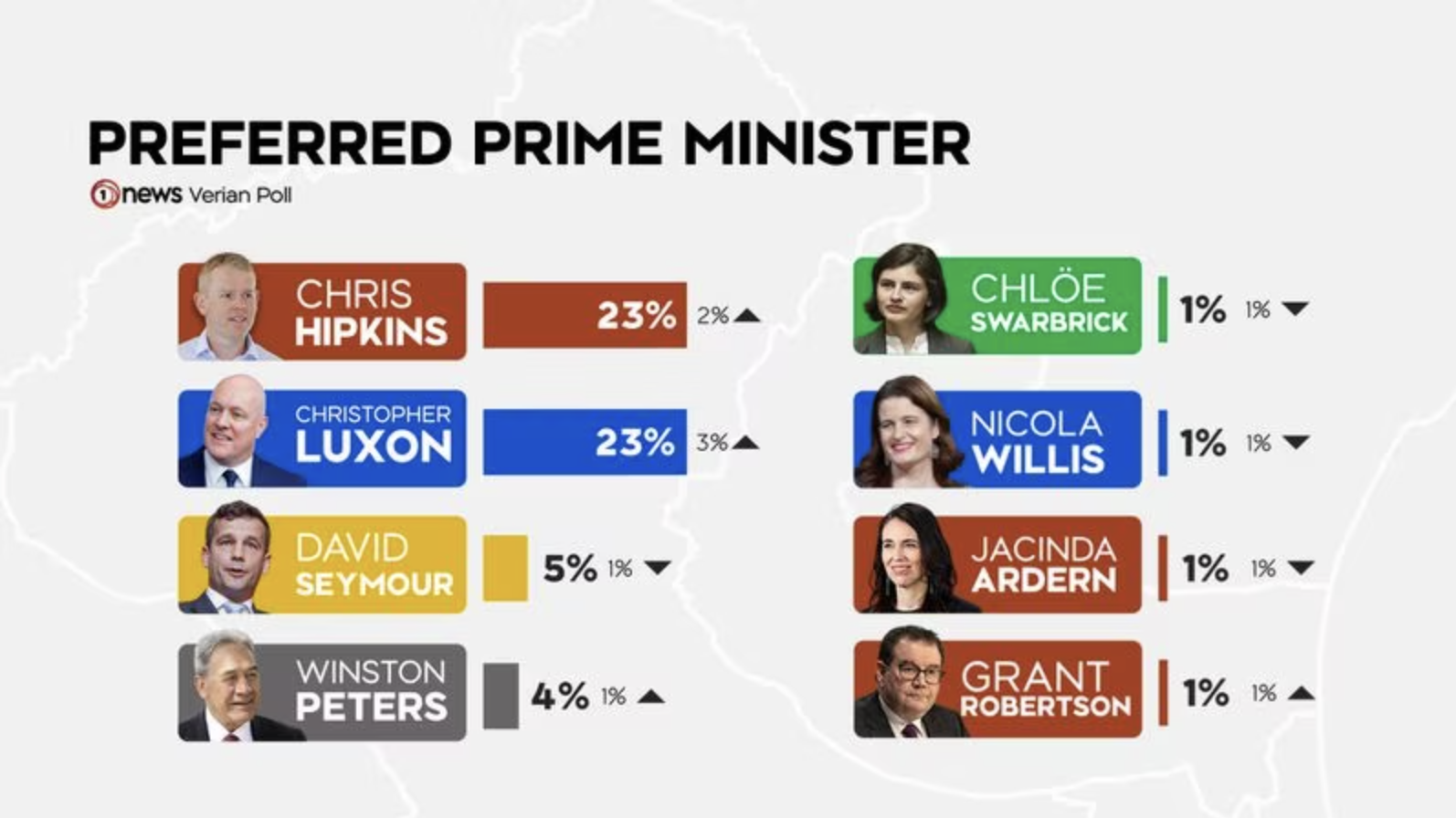 Labour’s Chris Hipkins and National’s Christopher Luxon are now tied in the preferred prime minister stakes at 23%, with Hipkins lifting 2% and Luxon up 3%.