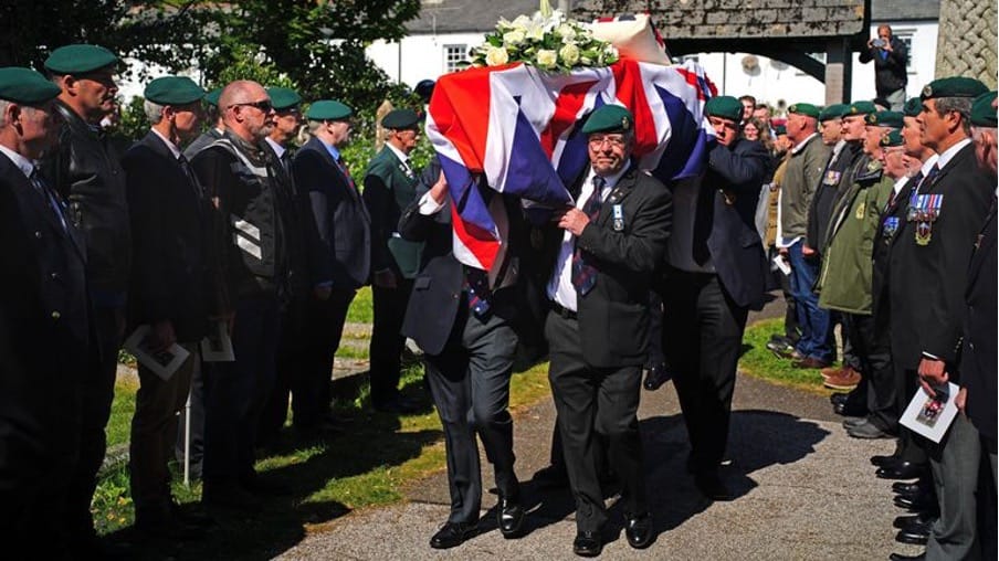 The coffin of the 96-year-old war veteran was carried into St Paul’s Church in Charlestown, Cornwall.