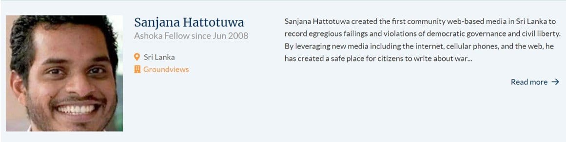 - TED: a World Economic Forum partner who list Hattotuwa in their 2011 fellows as a “citizen journalist”. TED’s funding initiative is the Audacious Project who name the Gates Foundation as a leading partner.
