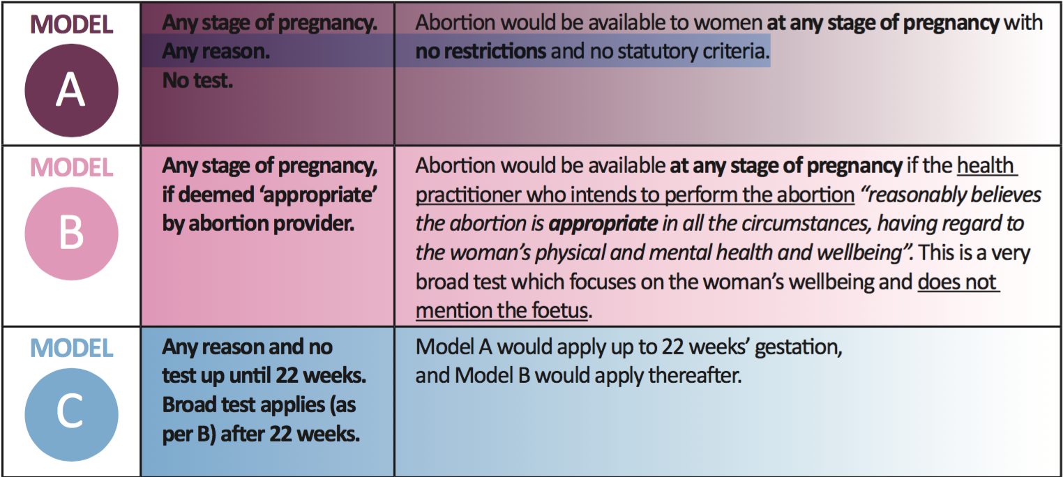 The government wants to treat abortion as a ‘health’ issue rather than a criminal issue. They have three proposed models for abortion law.