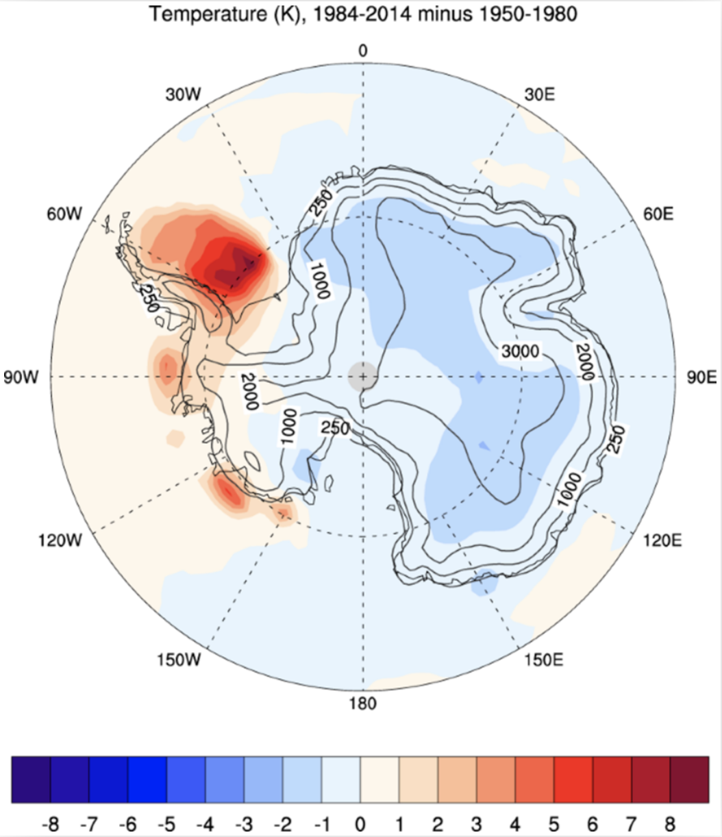 See the picture below, red means warmer and blue means cooler than the base time period of 1950 to 1980. You can see the rest of Antarctica is cooling and the Thwaites area is warming. Remember this is a vast continent, Antarctica is bigger than the United States.