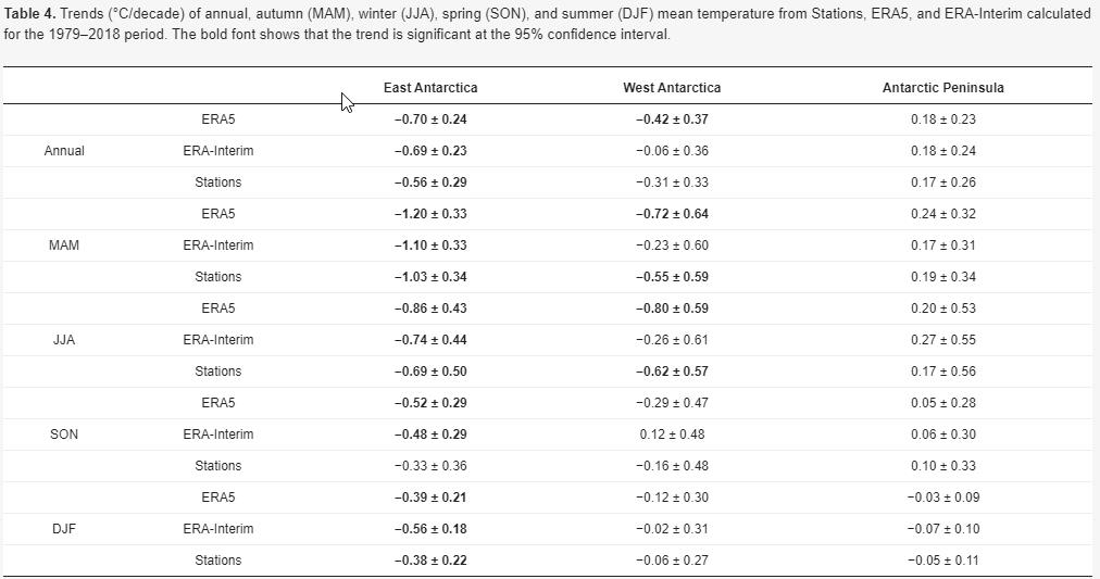 “It is also worth mentioning that the ERA5 shows a faster cooling rate than ERA-Interim and observations in West Antarctica. Over the Antarctic Peninsula, trends of annual and seasonal temperature means in ERA reanalyses and observations are not significant. ERA5 presents a warming trend with the exception of DJF, as is the case for ERA-Interim and station records.”