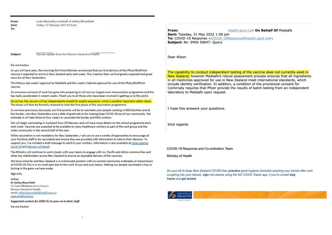 Dr Ashley Bloomfield stated every vaccinated Kiwi would be followed up, and these injections would undergo NZ’s own quality assurance and then rigorous independent safety monitoring. However, in an OIA response obtained earlier this year, Medsafe has revealed no such QA was possible in New Zealand. He ‘misstated’ on both these matters.