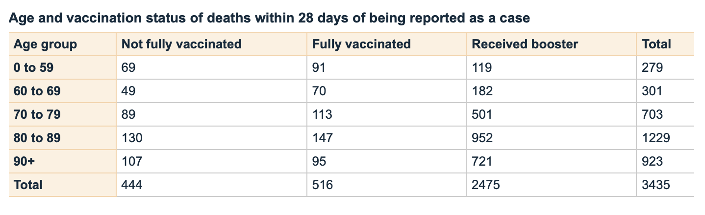The Ministry of Health Covid-19 Case demographics, as listed on the Ministry of Health website, show that out of the 3435 deaths from Covid-19 in our nation so far, 2475 of them are boosted. That’s a whopping 72% of deaths from the boosted group, and it looks even grimmer if you add in the fully vaccinated group. This data isn’t representative of the per 100,000 population, but it is mainstream data presented on the Ministry of Health website.