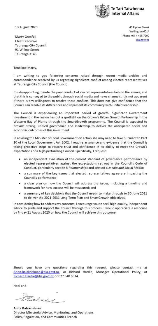 These matters have recently come to the attention of the Department of Internal Affairs (DIA), and doubtless have been noted by the Minister for Local Government. On 13 August 2020 the Chief Executive received a letter from the Director Ministerial Advice, Monitoring and Operations, DIA