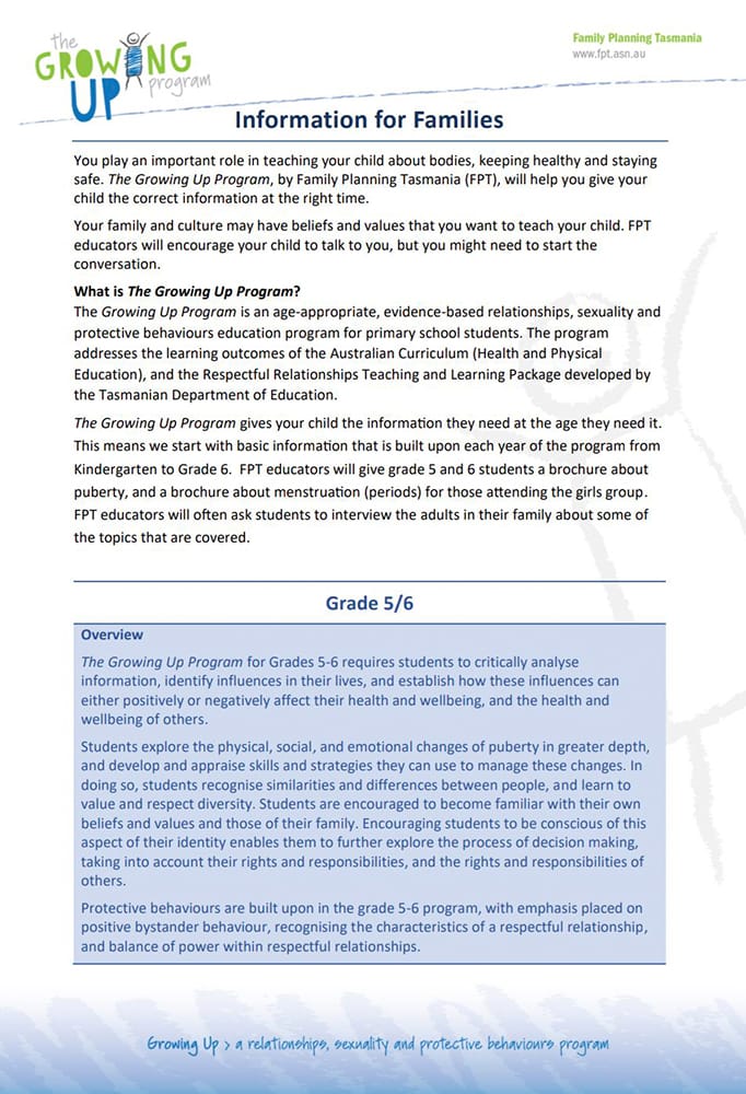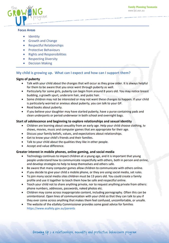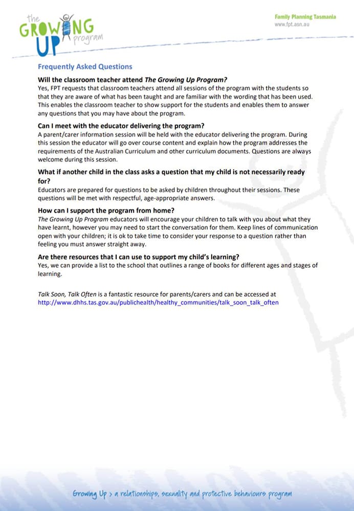 Another concerned mother who contacted her children’s school, requesting access to the teaching materials used in GUP was given only general information pages – full of fluff, but no detail. The school directed her to the Family Planning Tasmania website, where she was unable to find any additional information.