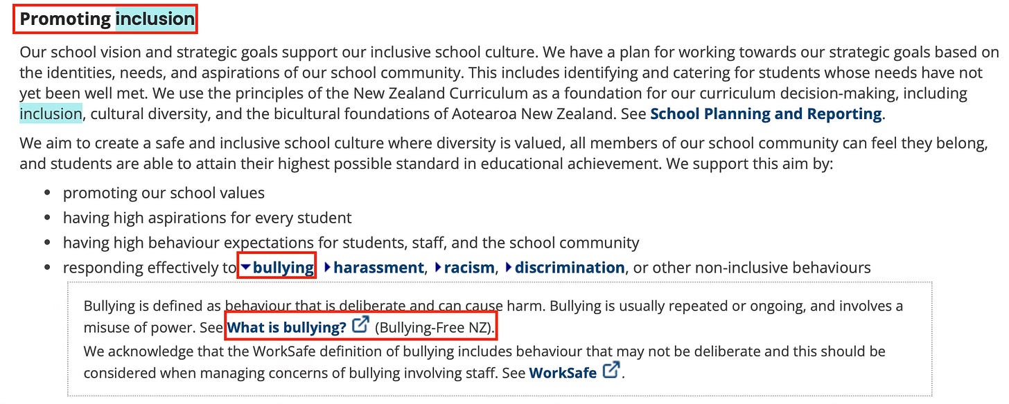 SchoolDocs’ bullying section uses a standard definition (deliberate, harmful, repeated, misuse of power) and then sends schools to Bullying‑Free NZ for “what is bullying?” From there, schools are funnelled straight into Pink Shirt Day (an event run by the Mental Health Foundation) and a PPTA (teachers union) 2017 paper from their ‘Rainbow Taskforce’ on ‘Affirming diversities of sexualities and gender identities in the school community’.