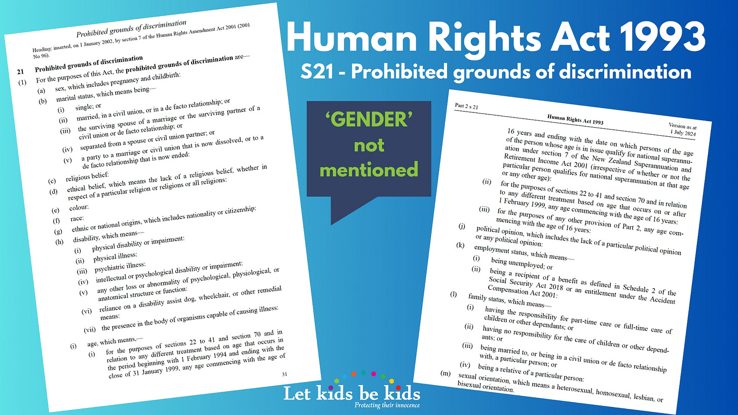 Let Kids Be Kids stands for sex‑based rights. If a policy claims to quote legislation, it must do so accurately. If SchoolDocs want to promote a particular ideology about ‘gender’, it should say so openly – not hide it behind a false legal citation. See Penny Marie explaining ‘gender identity’ at the NZ First convention in 2025.