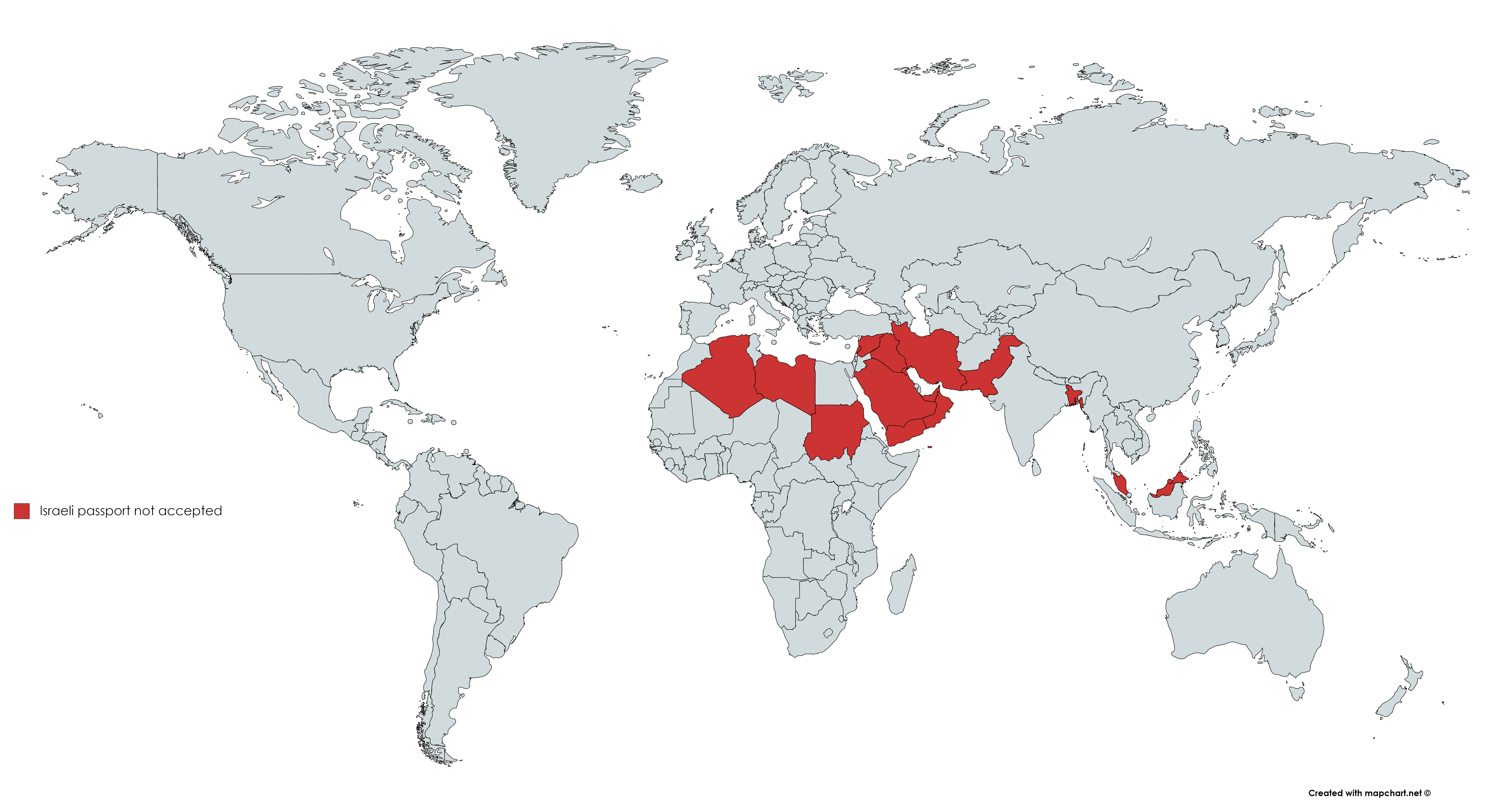 Map of the day. Countries which forbid admission to Israeli passport holders. Source: https://i.redd.it/x6xxfknxmr951.png