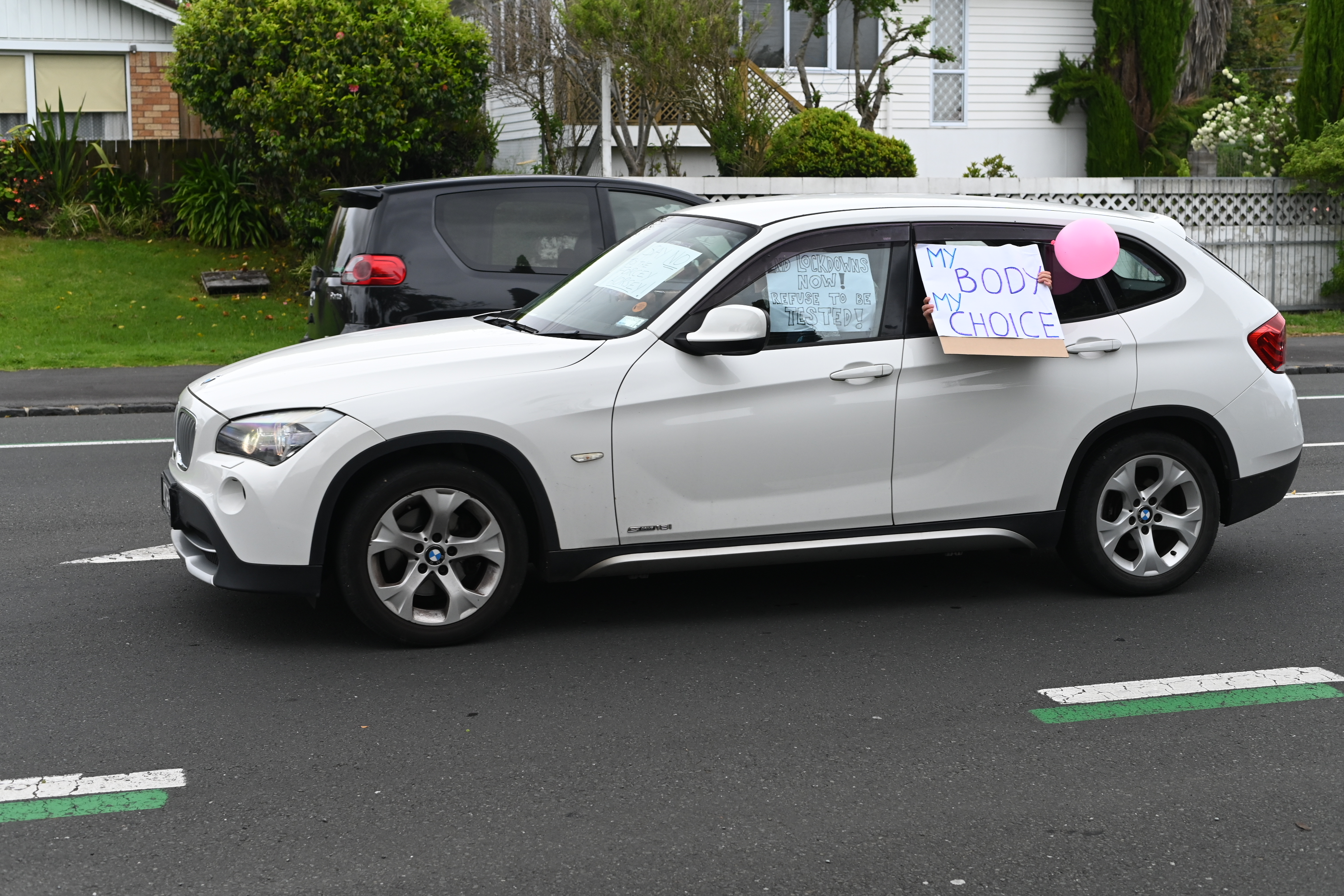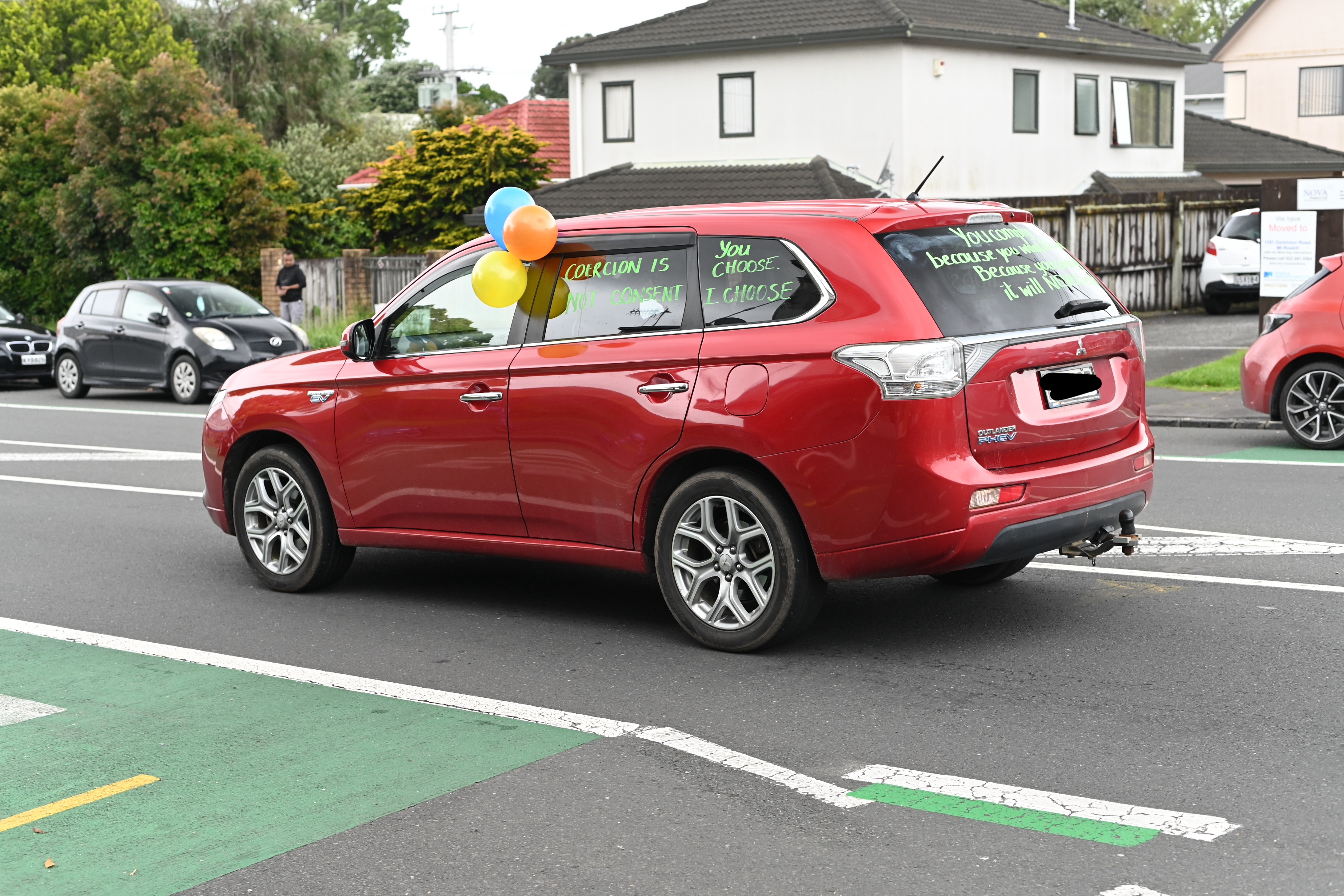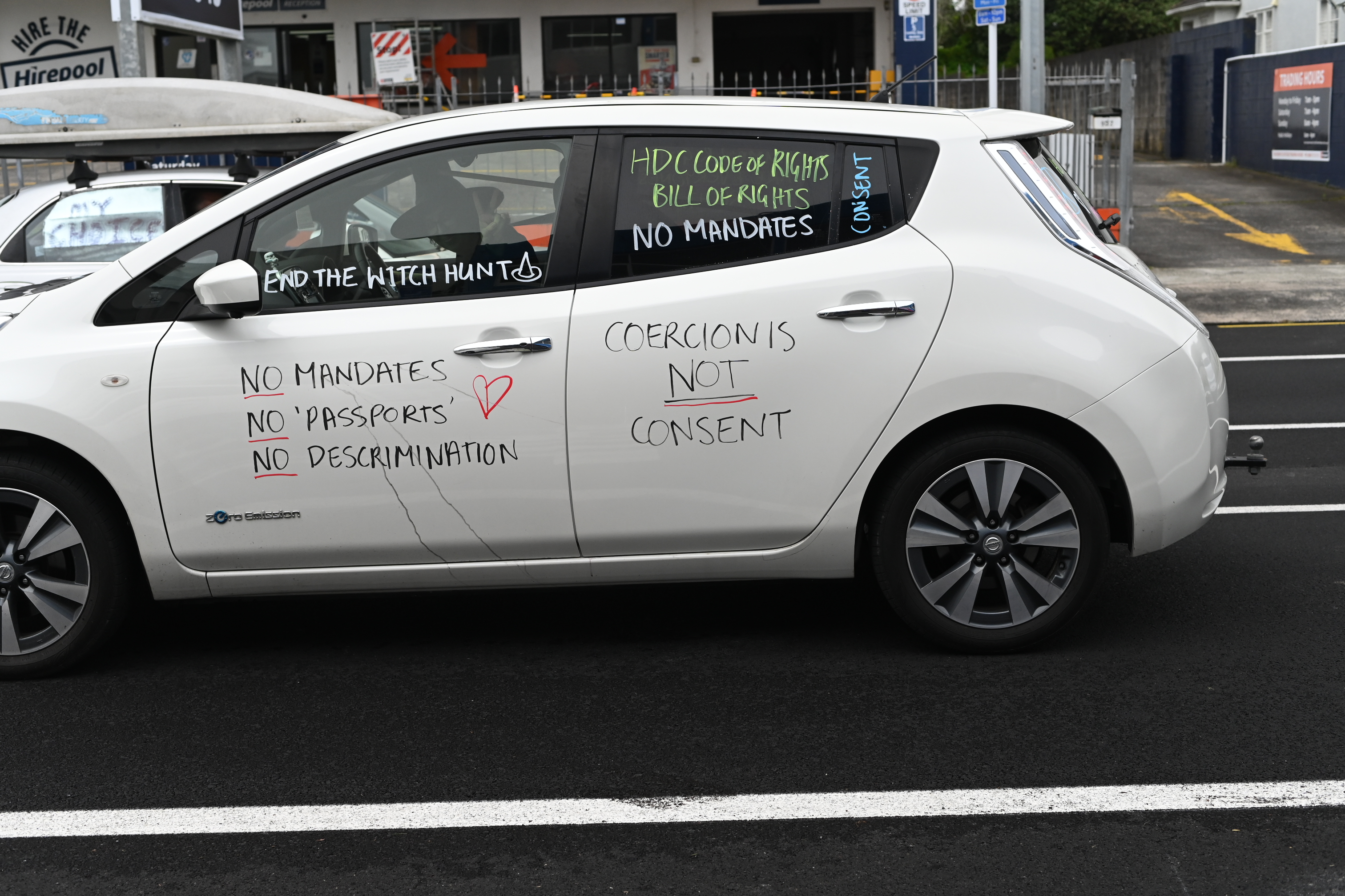 The protesters drove up and down tooting their horns, with many vehicles bearing slogans including “Hold the line” and “Coercion is not consent”.