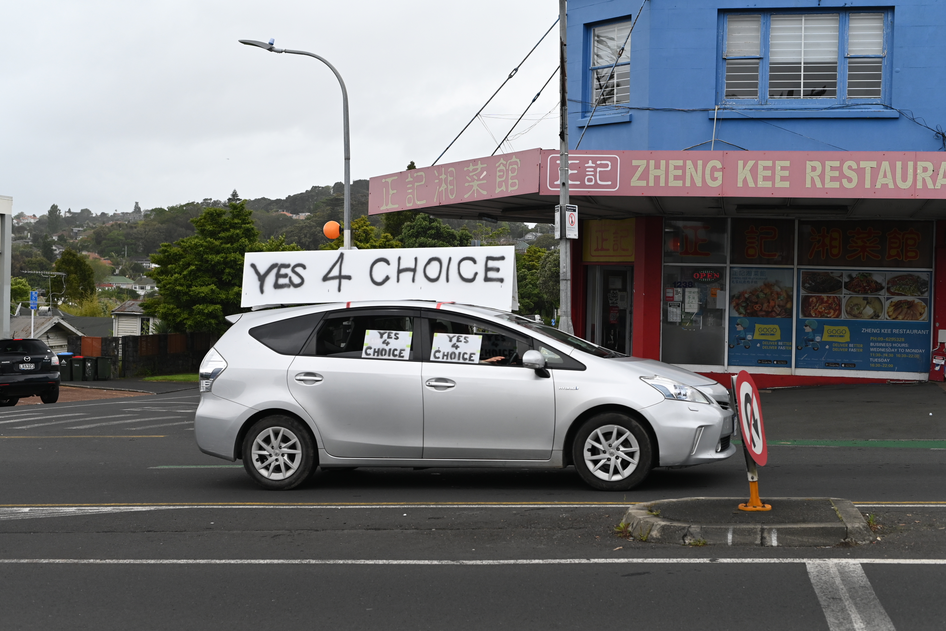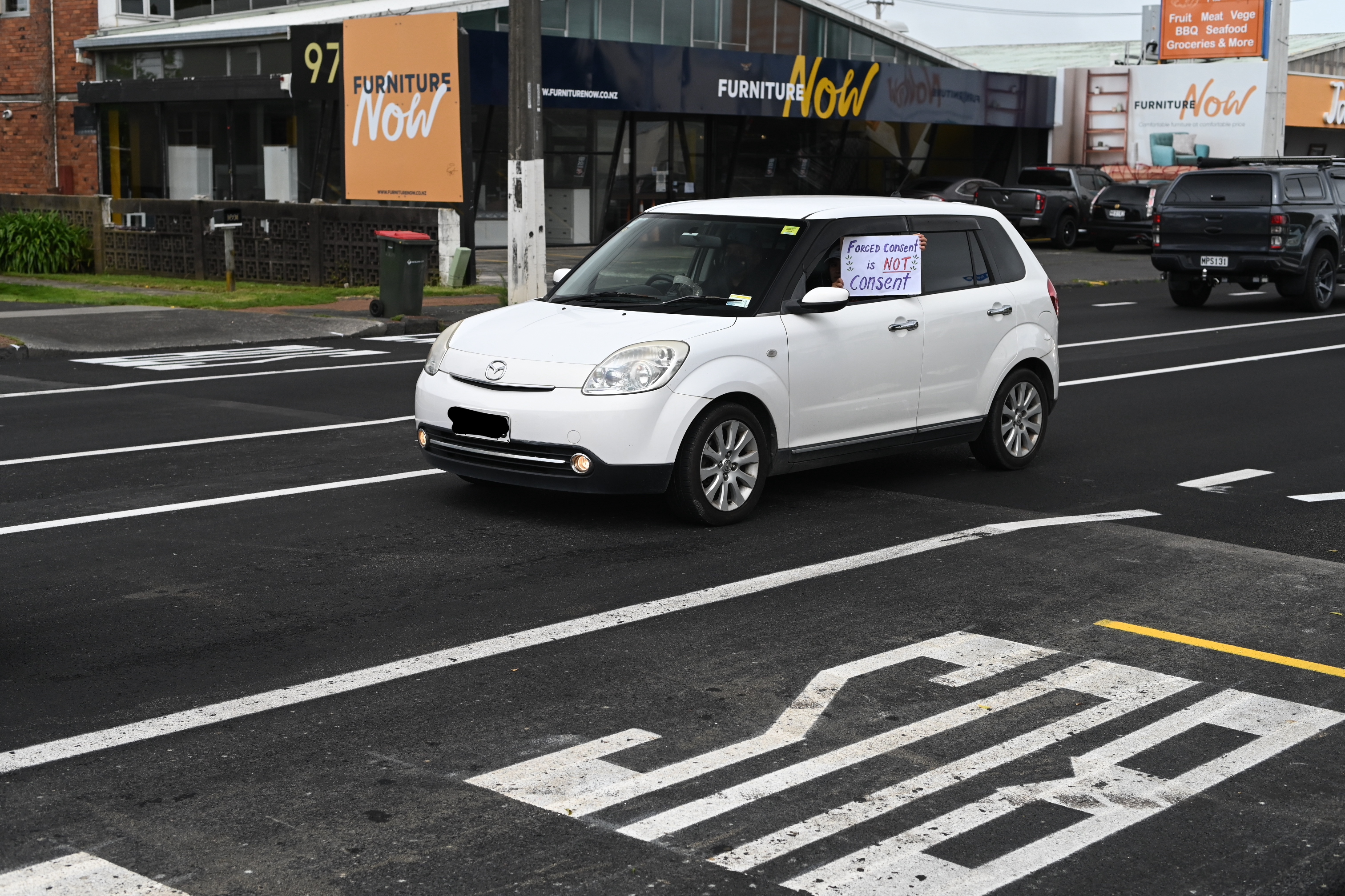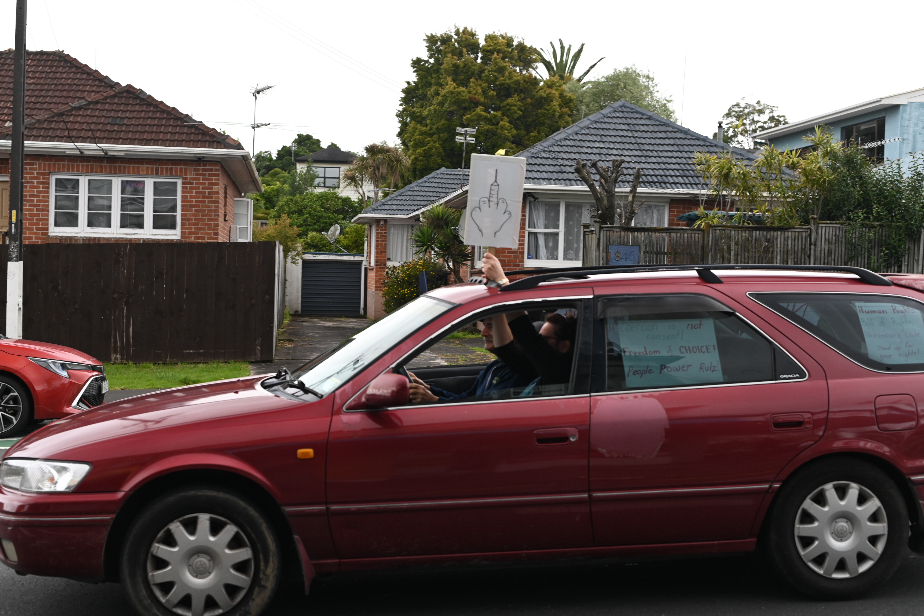 The protesters drove up and down tooting their horns, with many vehicles bearing slogans including “Hold the line” and “Coercion is not consent”.