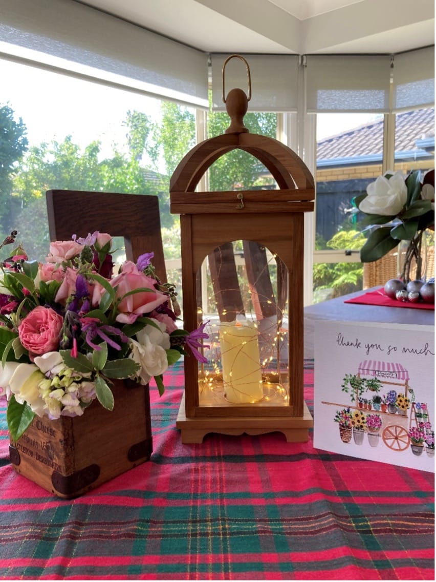 As sump organisers, we were totally blown away after receiving unexpected thank you gifts and a card. One helped with design, and another put their skills to work and made a wooden lantern complete with glass, a candle and built-in fairy lights plus a bouquet of gorgeous flowers out of their pretty garden in a cute wooden pot -see below. Talent extraordinaire! Beautifully made. Treasured.