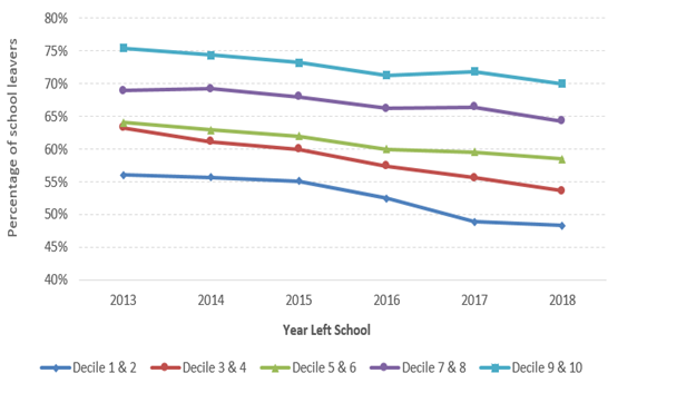[S]tudents from higher decile schools are more likely to enrol in tertiary education. From the 2018 leaver cohort, 70.0% of school leavers from schools in decile 9 ad 10 enrolled in tertiary education in 2019. This compares with 48.3% of leavers from schools in decile 1 and 2. Students from the higher decile schools are also, generally, enrolled in courses that lead to higher remuneration.