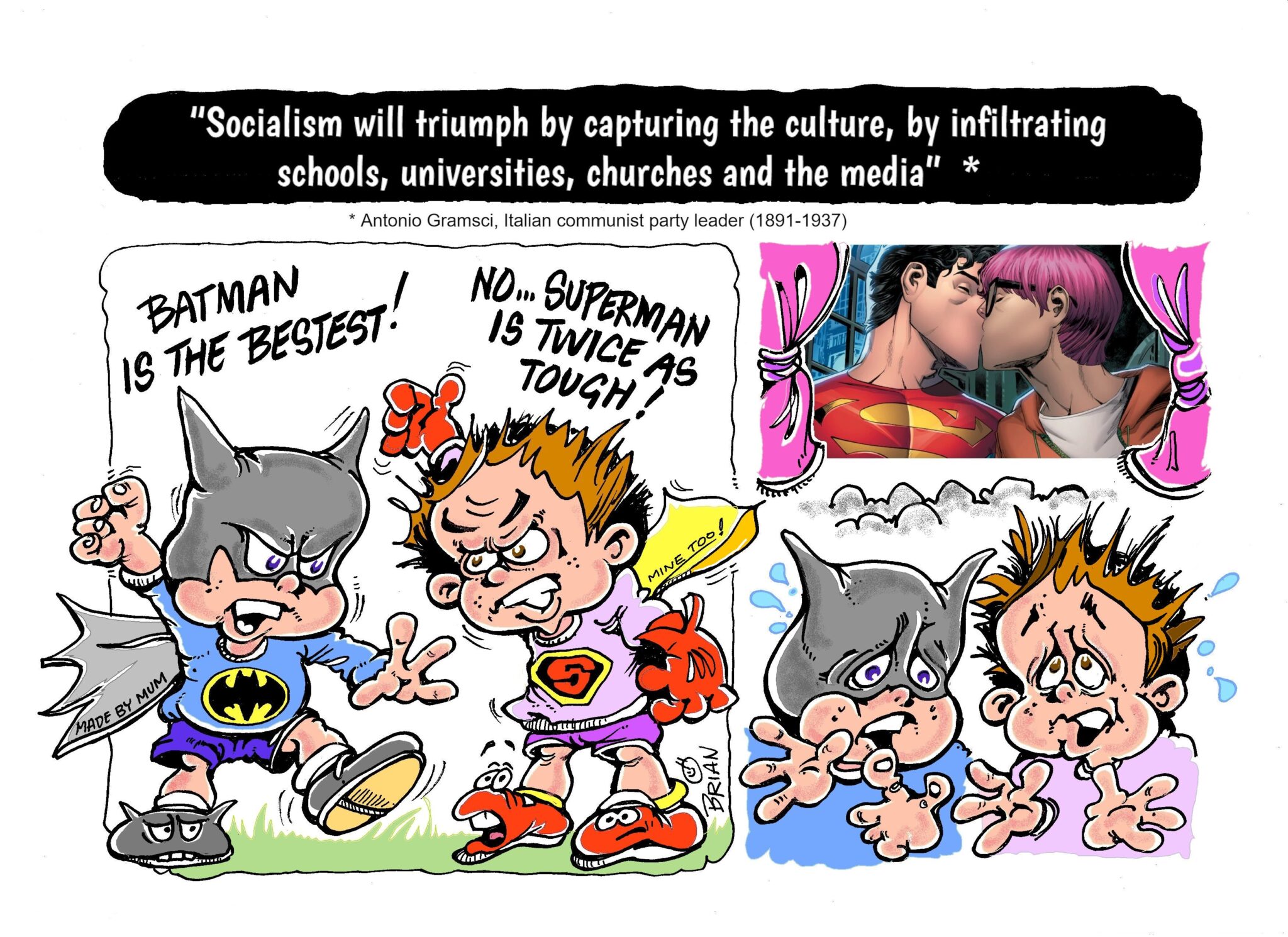 But Superman’s newfound sexuality, says Cain, is not brave or groundbreaking at all. “Brave would be having him fighting for the rights of gay people in Iran where they’ll throw you off a building for the offence of being gay … or fighting for the rights of women to attend school and have the ability to work and live, and boys not to be raped by men under the new warm and fuzzy Taliban. That would be brave.”