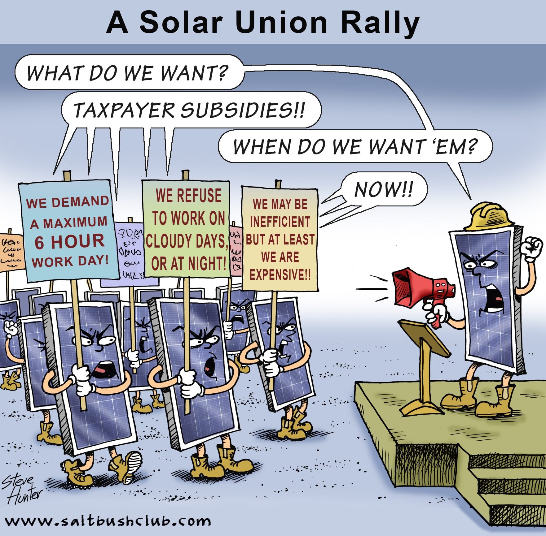 There are two troublesome Green Energy unions – the Solar Workers down tools every night and cloudy day, and the Turbine Crews stop work if winds are too weak or too strong. And wind droughts can last for days. The reliable Coal and Gas Crews spend sunny days playing cards, but are expected to keep their turbines revving up and down to keep stable power in the lines.