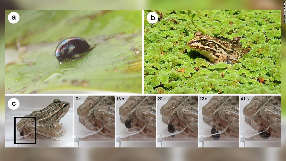 Writing today in the journal Current Biology, Kobe University ecologist Shinji Sugiura describes how the beetle, locked behind the frog’s jaws, turns around and scrambles through its digestive tract. In carefully designed lab experiments, Sugiura found that 93 percent of the beetles he fed to the frog Pelophylax nigromaculatus escaped the predator’s “vent”—aka anus—within four hours, “frequently entangled in fecal pellets,” he writes. The quickest run from mouth to anus was just six minutes. The beetles then went about their day as if they hadn’t just spelunked through a digestive system, and even swam effectively.