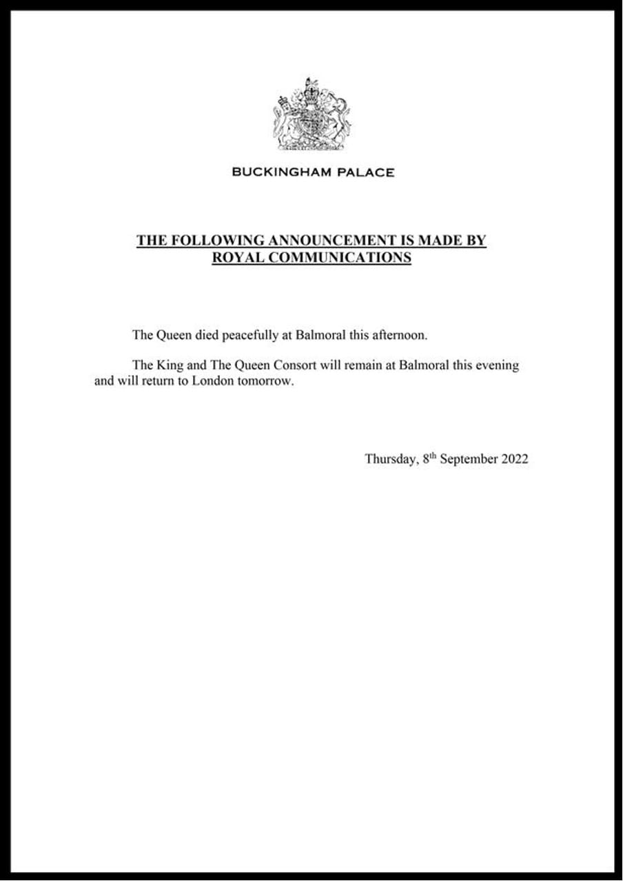 Her Majesty The Queen has died, Buckingham Palace has announced. In a statement, the palace said: “The Queen died peacefully at Balmoral this afternoon. “The King and The Queen Consort will remain at Balmoral this evening and will return to London tomorrow.”