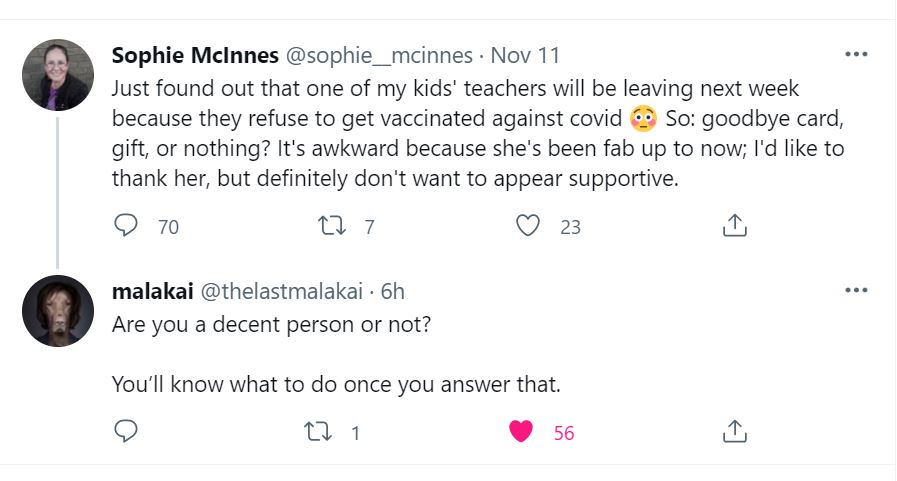 The teacher is losing her livelihood because she is concerned about the Pfizer vaccine. The government has, in its own way, acknowledged some people’s concerns, by (finally) making the Astra-Zeneca vaccine available in New Zealand. Anyone has the right to be concerned about something they put into their own body. That response, by a parent who thinks vaccination is more important than keeping a good teacher, is a disgrace, but that kind of thinking is sadly all too common these days.