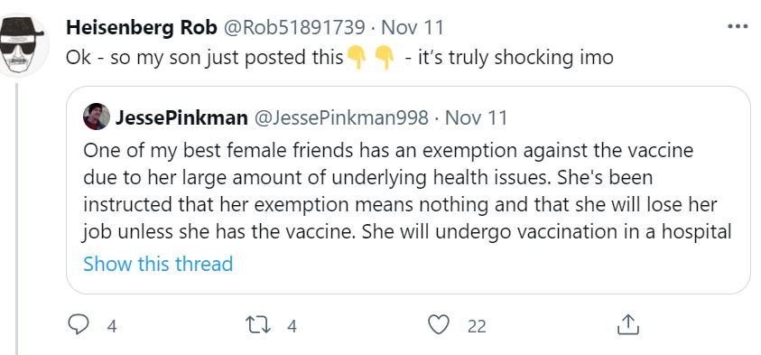 What? Medical exemptions have to be signed off by Reichsfuhrer Bloomfield himself, so there is no chance of this lady faking her condition. This isn’t just ‘no jab, no job’. This is ‘have the jab, even if it kills you’.